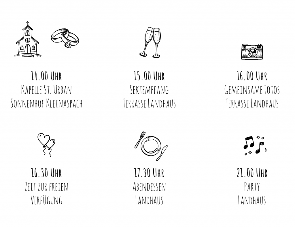 Die Trauung findet voraussichtlich im Freien statt. Je nach Wetter bitte an entsprechende Kleidung denken.